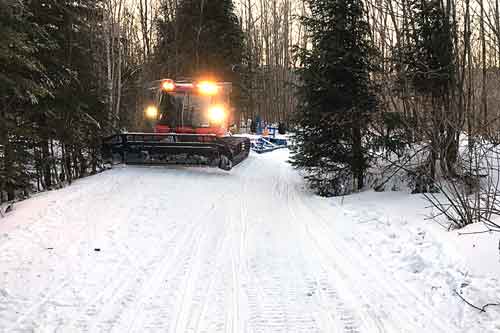 The groomer is moving at about 6-8 mph, has flashing or rotating lights on it, and is not camouflaged (usually red, orange, yellow or silver). On trails that are wider than a groomer (Coos County) you might find two groomers working in tandem on a section of heavily used trail. No different than two DOT trucks plowing I-93 in a storm.