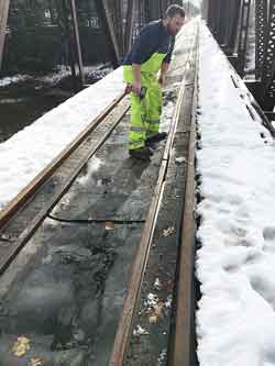 These corridors take a lot of work to be ready for a short period of time. All of thetrestlebridges have to have rubber belting put down between the rails and this is time consuming and a little tricky. The belting serves to hold snow on the bridges and also to protect the railroad bridge ties from damage from skis and tracks.