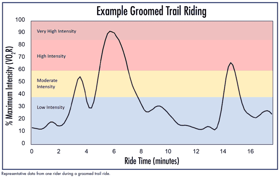Researchers collected information from more than 4,000 people who rode at least once per week. They found that on average, riding a snowmobile used 5.6 METs. This means that a snowmobile rider is using 5.6 times as much energy while riding than if they were sitting at home watching TV. The 5.6 METS used during a typical ride is similar to the amount of energy used during downhill skiing or snow shoveling and categorizes snowmobiling as moderate intensity physical activity.